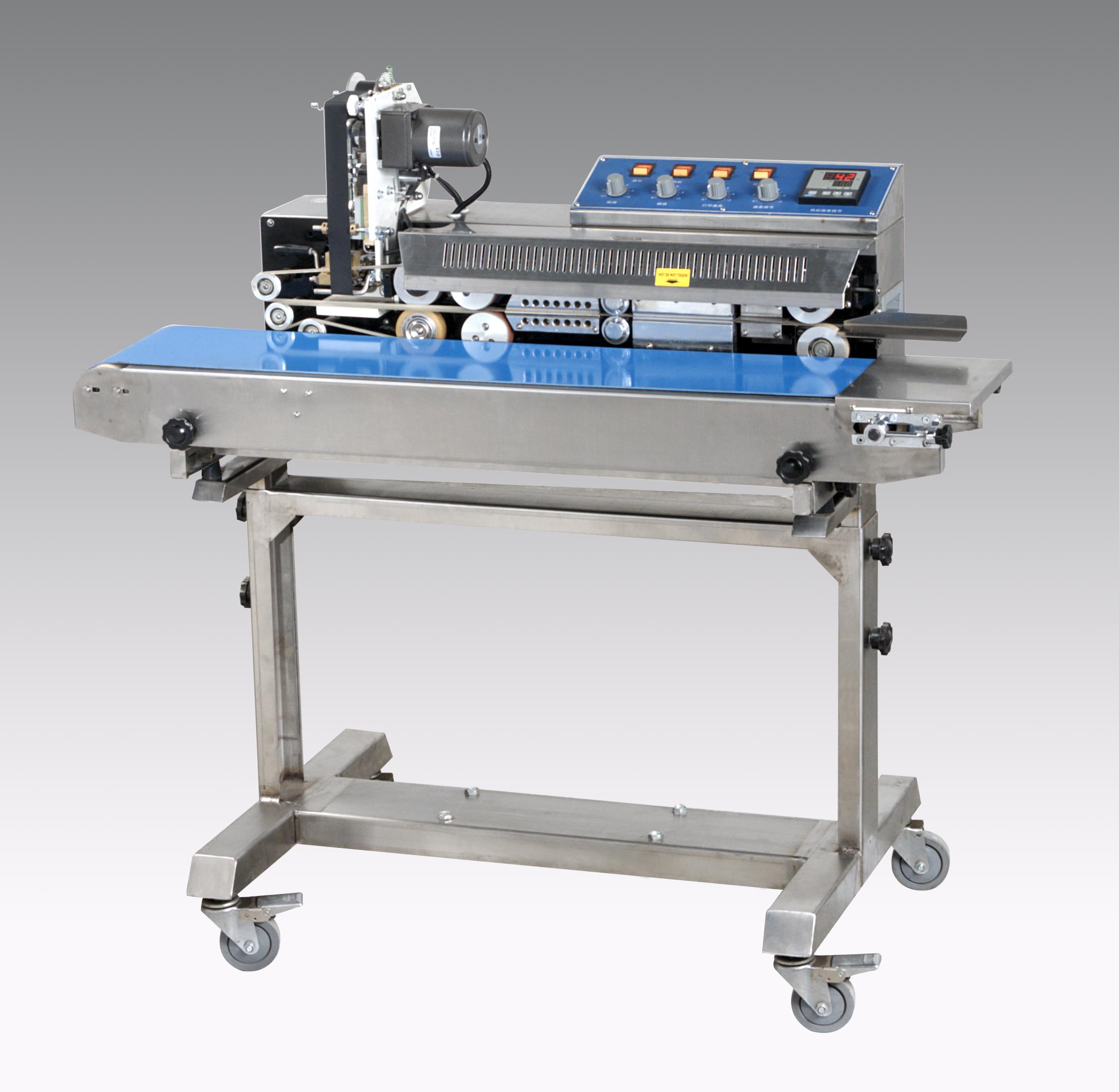 | 連續(xù)封口機(jī)(墨輪印字) 該機(jī)在封口的同時(shí)采用固體墨輪印制有色標(biāo)簽,字跡清晰,顏色可選,瞬印瞬干,附著力強(qiáng) [點(diǎn)擊詳情] |